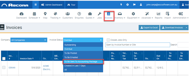 1. Log into your Ascora Web Portal and click on Invoices and then select invoice status To Be Sent To Accounting Package.