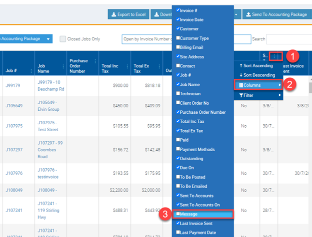 2. If Message column is not available, simply click on the 3 dots from any of the existing columns, select Columns, and then tick the box beside Message. After completing these steps, the Message column will already become visible.