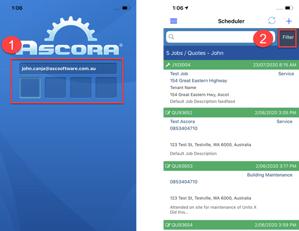 1. Log in to the Mobile App by entering your User email address and assigned Pin Code and tap on the Filter icon on the upper right.