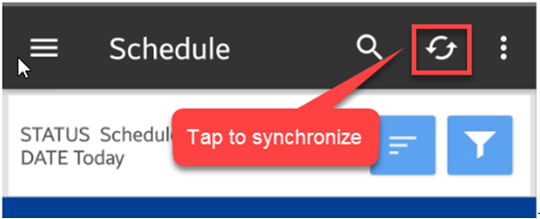 1. Tap the icon located on the left of the three dots. This will do synchronisation and a notification appears on the lower part of the screen “synchronisation started” and waits for it to show “synchronisation finished.”