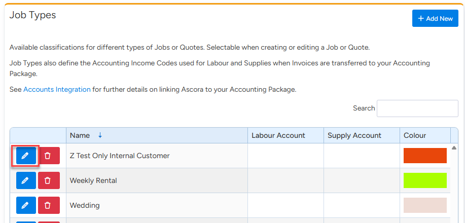 2. Click Edit (pencil) beside the Job name where you want to set up a default checklist.
