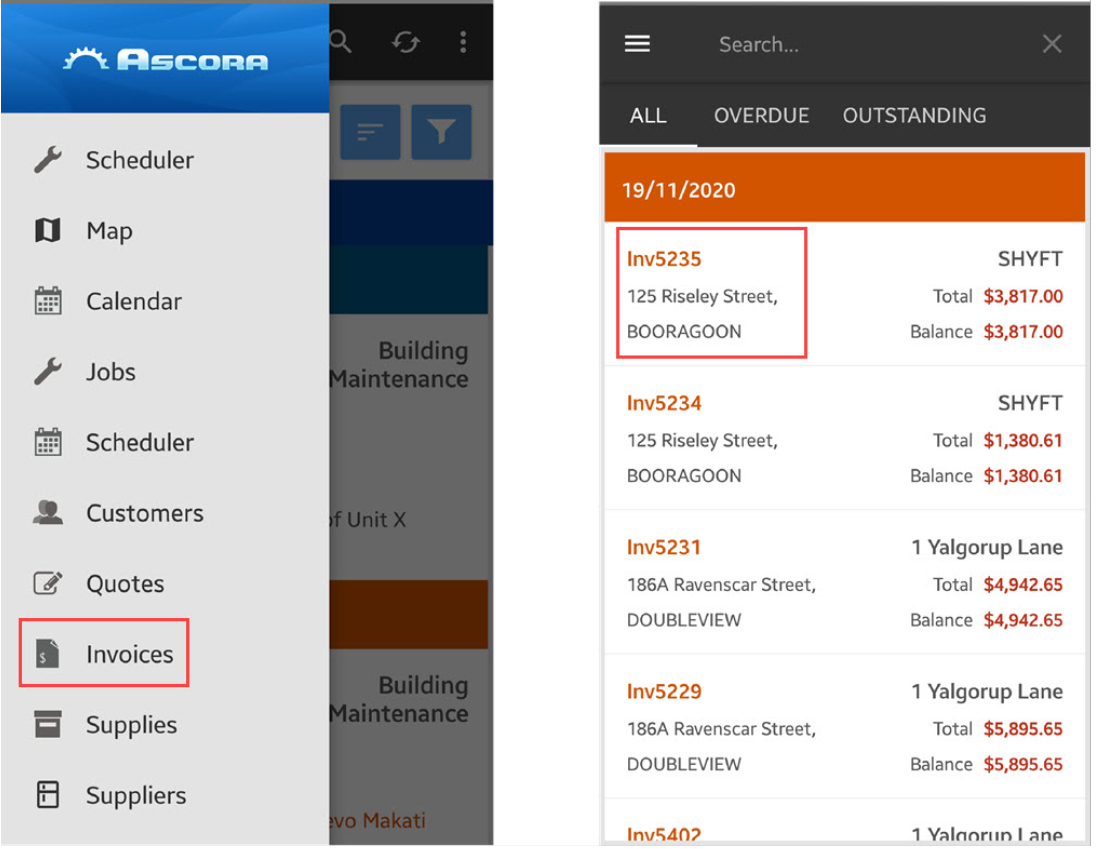 1. On your mobile app, Go to Invoices and look for outstanding invoice with payment that you need to process.