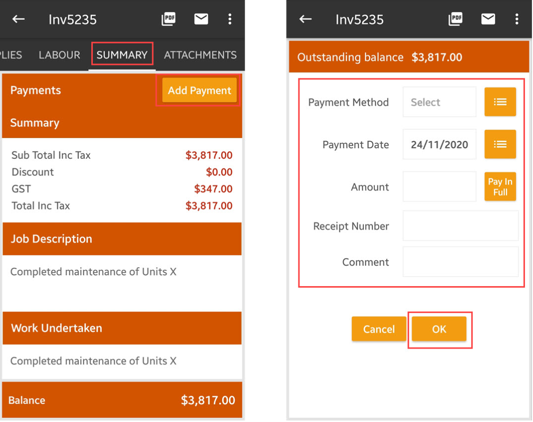 2. Tap Summary and then Add Payment. On the next screen, enter the payment details such as payment method, payment date and amount. Once done, tap OK.