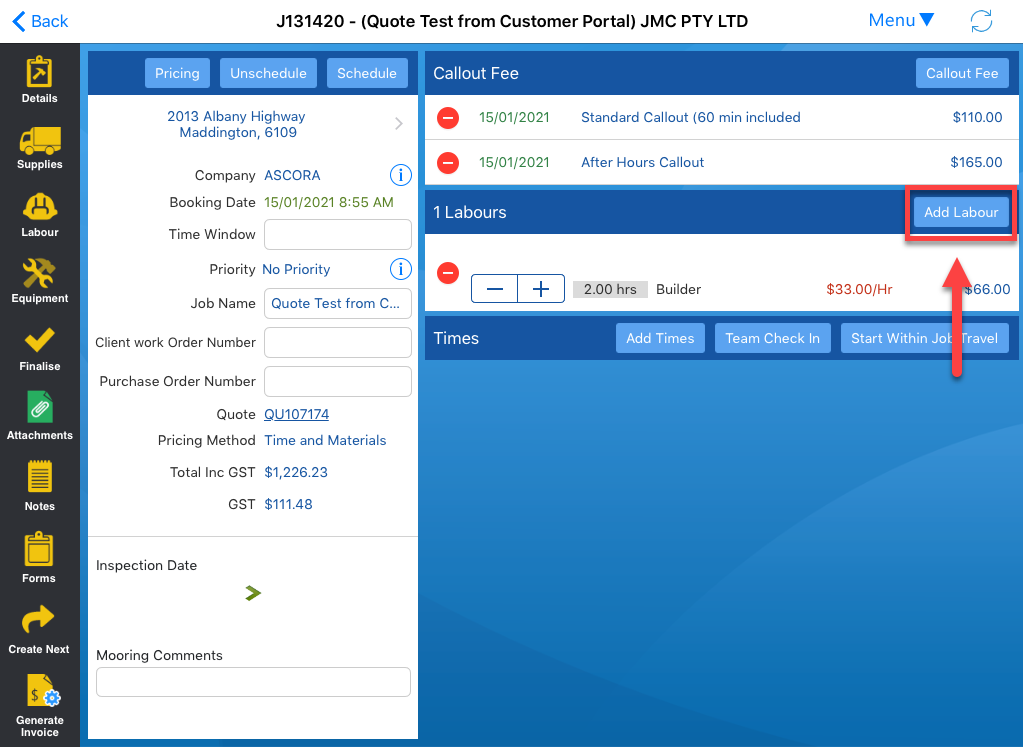 - Choose the Labour & Callout Tab on the Job Card and scroll down to the Labour section.