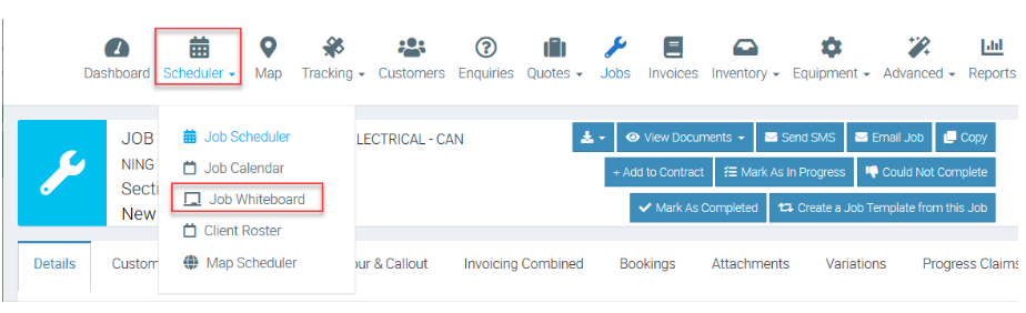 The Job Whiteboard can be accessed from the Scheduled option in the main navigation bar.