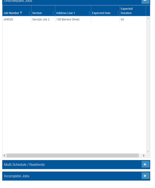 The left side of the Job Whiteboard contains a view of all unscheduled Jobs as well as any Jobs marked for Reattendance or Allows Additional Bookings and Incomplete Jobs.The Jobs in these grids can be filtered based on entered search terms in the Search field or by the selected Job Type below. This section should operate almost identically to the Job Scheduler and Job Calendar areas.