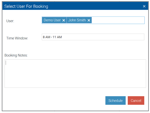 When the Job has been dragged onto the Whiteboard, a window will pop-up to assign users for the Booking, a time window, and booking notes.