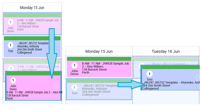 In the following example, we are moving Job J132884 from Tuesday to Friday and this one has total of 3 assigned users.