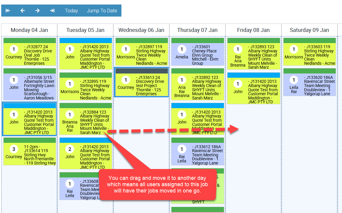 - Drag and drop jobs to reschedule or reassign them seamlessly.