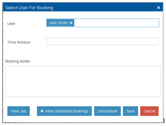 Double clicking on a booked job allows for the assigned Users, time window, and booking notes to be adjusted. It also allows the Job to be viewed, marked to allow additional bookings, or unschedule all Bookings within the group.