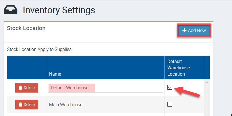 2. Click Add New and enter the location name. In this example, we call it Default Warehouse.