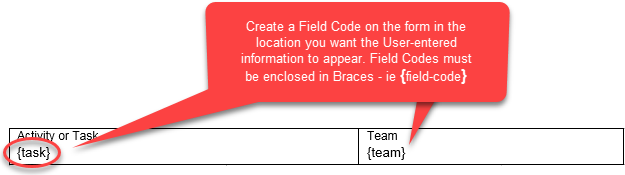 For each Field within the Form Template that the User is required to action, you must create a Field Code. A Field Code can consist of any alpha-numeric text combination that you wish, and must be enclosed in Braces. Braces, or Squiggly Brackets look like this: { }