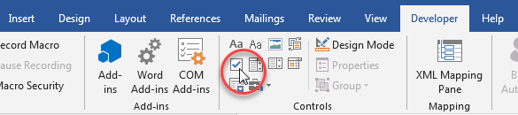 Place the cursor where you wish to create a Check-box and choose the Developer Tab in the Ribbon.