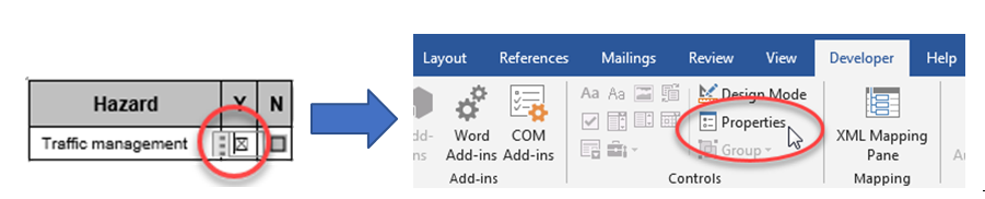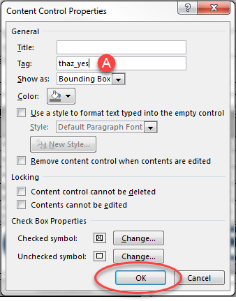 Click the Check-box and then choose Properties from the Developer Tab. The Content Control Properties pop-up window will display.