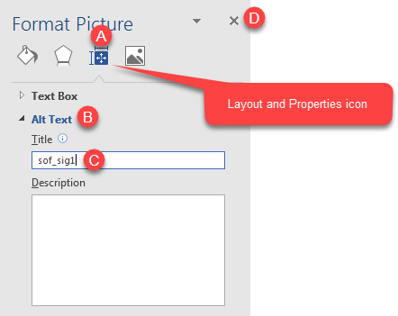 Select the Layout and Properties icon (A), click on Alt Text (B) to expand the Alt Text menu and then enter the Field Code into the Title text box (C). Note that for Signature and Photo Fields you do not need to include the enclosing Braces.