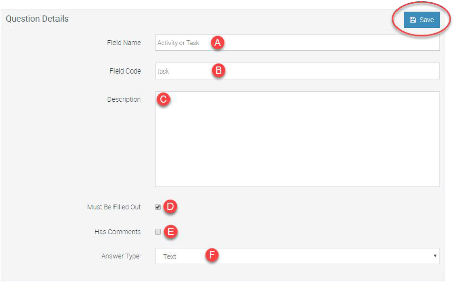 In the Question Details section, enter the information for each Field Code you create on the Form Template. Create each Question in the same order they appear on the Form Template to ensure a logical flow of questions for the User.