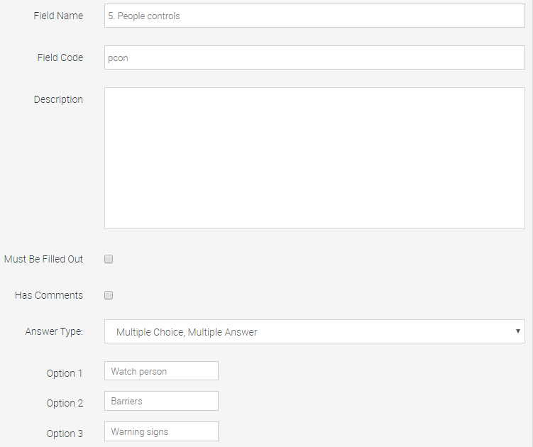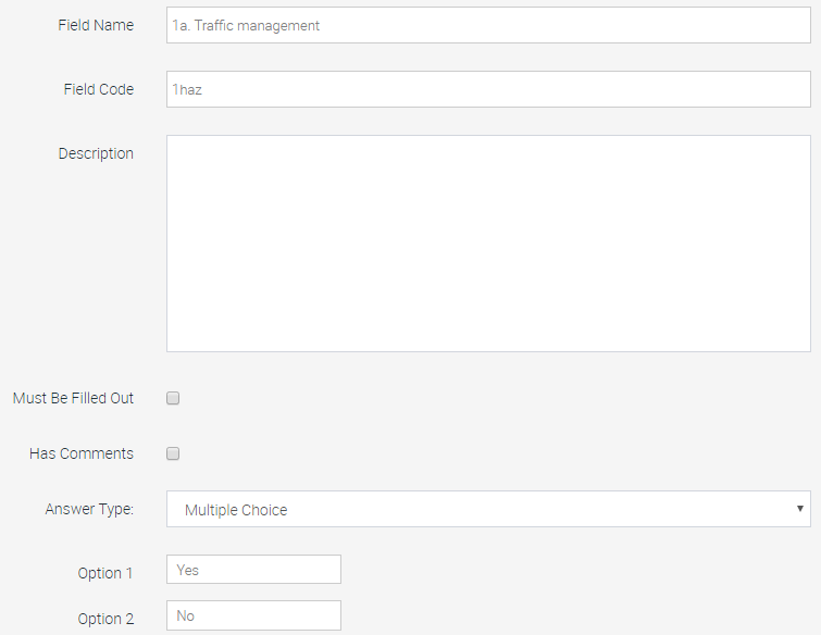 - Enter the Field Name and Description as before. Choose whether to mark this Question as Must Be Filled Out and/or Has Comments