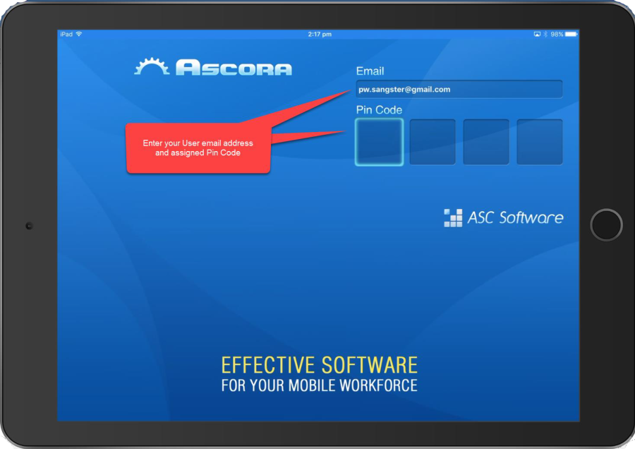 Log in to the Mobile App by entering your User email address and assigned Pin Code