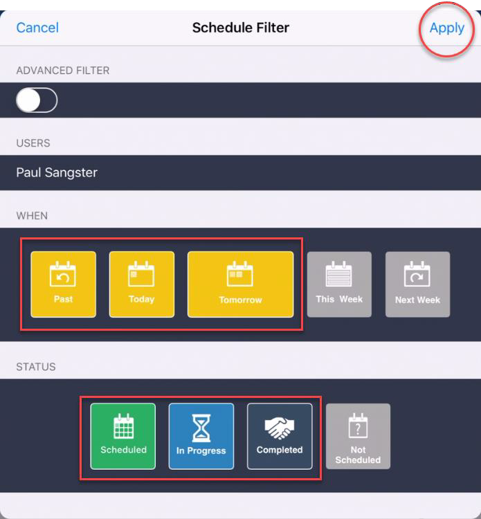 In the WHEN section, activate Past, Today and Tomorrow by tapping the respective icons. In the STATUS section, activate Scheduled, In Progress and Completed. When ready, tap Apply.