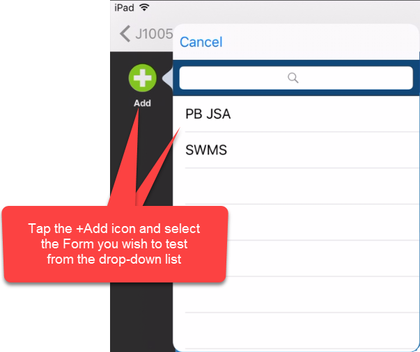 Tap the +Add icon. This will display a drop-down list of all available Custom Forms. Select the Custom Form you wish to test by tapping it.