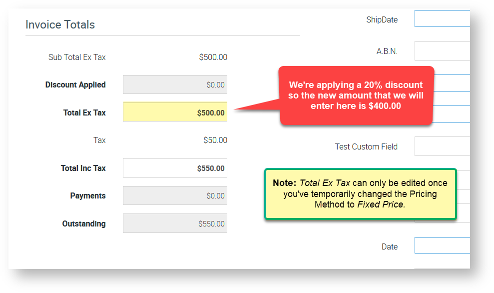 In this example, we have an invoice with a Total Ex Tax of $500.00 and we're applying a 20% discount.