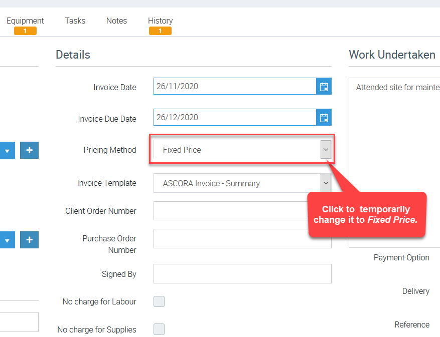 2. Change the Pricing Method to Fixed Price since this is the only pricing method that allows you to edit invoice Total Ex Tax or allow you to apply a discount.