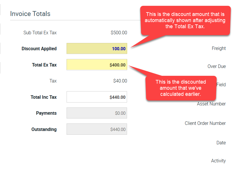 To apply the discount, edit the Total Ex Tax by entering the discounted amount which is $400.00 calculated by (Original Amount Ex Tax $500.00 - Discount Amount $100.00 or discount of 20%)