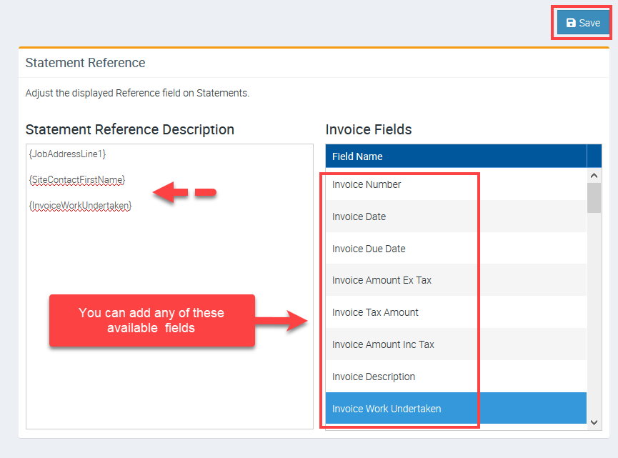 2. Point the mouse cursor on the left panel below Statement Reference Description where you want to add the fields and click the field name located on the right panel below Invoice Fields.