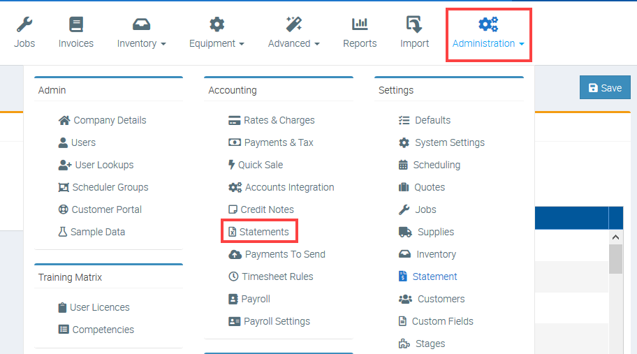 3. Go to Administration → and click Statements under Accounting area.