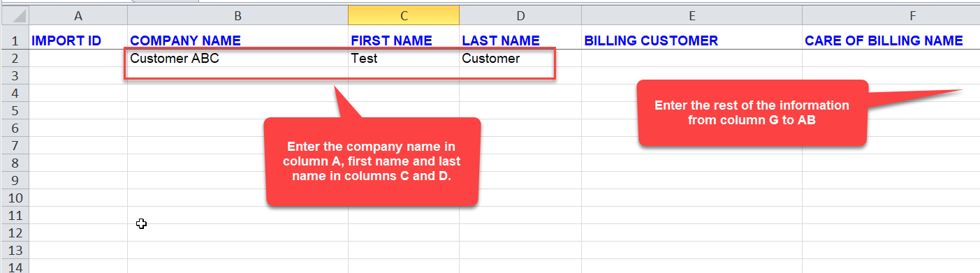 2. Open the import template and enter the customer details in all columns and skip the ones that are not applicable.