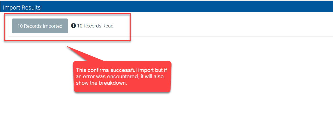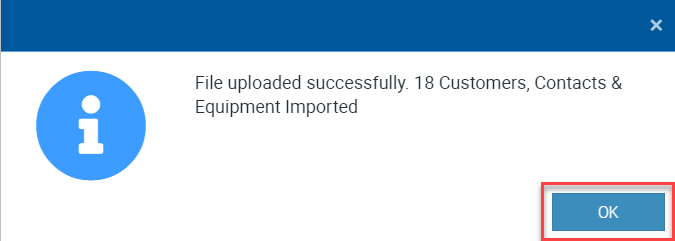 4. The following pop up box appears confirming that import is successful and depending on the amount of data from the import template, it could take to a few seconds to a few minutes for the data to appear.