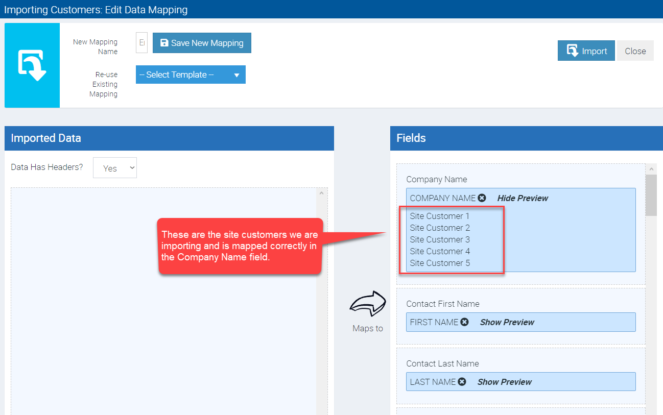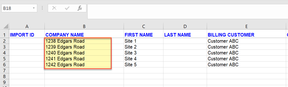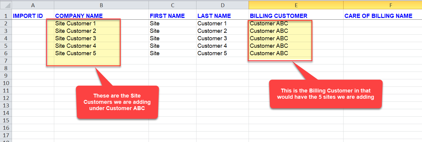 In this example, we have a column called Billing Customer and we are importing 5 sites under Customer ABC.