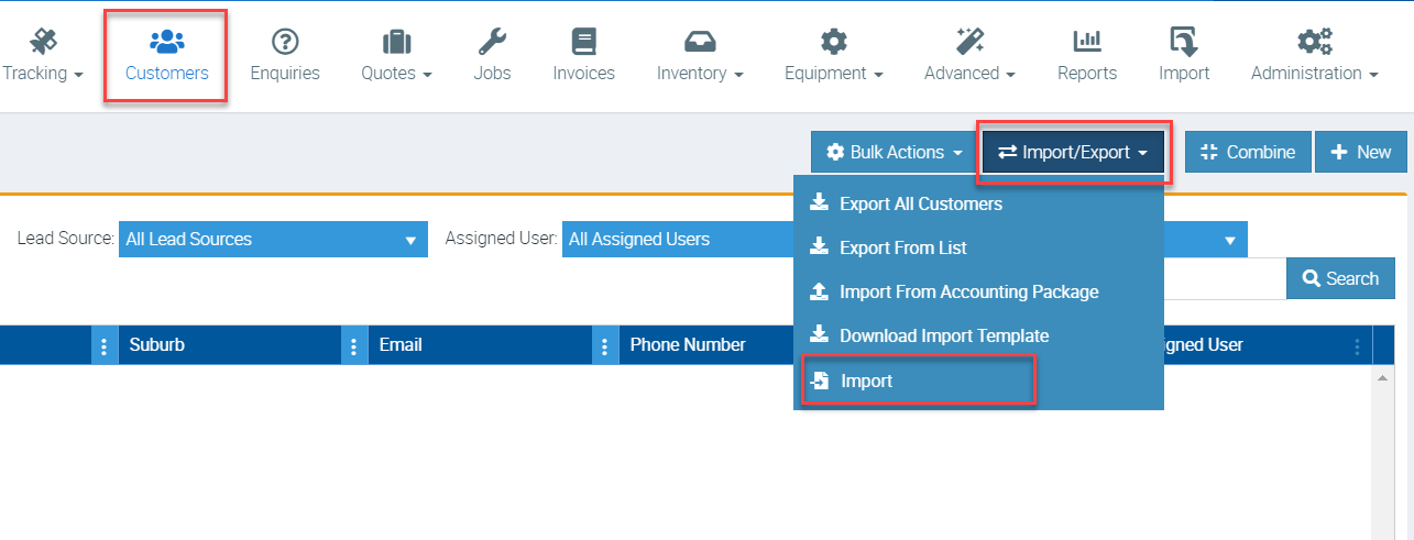 3. Once your customer import file is complete, save the file and go back to Customers→ Import/Export → but this time, click on Import.