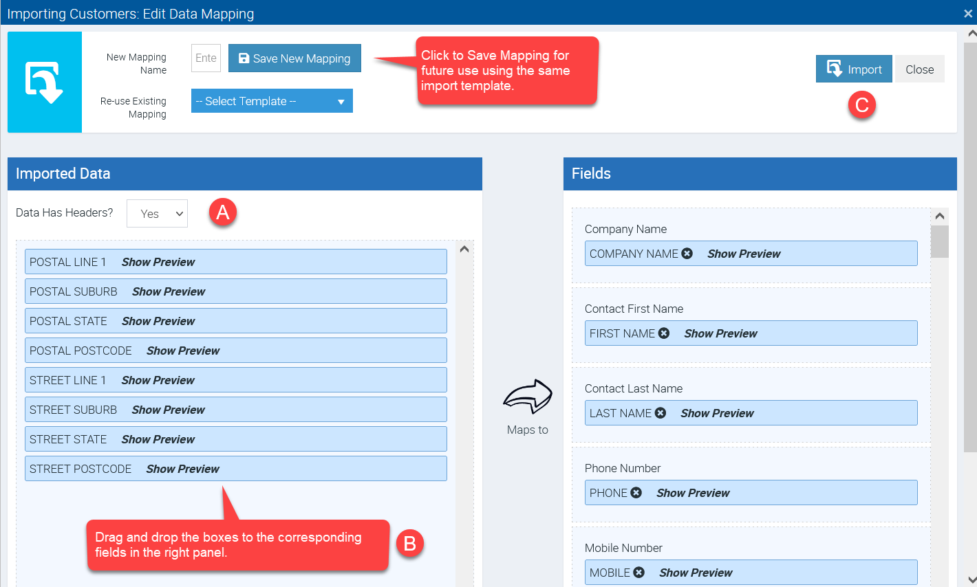 3. The Data Mapping screen appears for you to map the fields or double check if fields are mapped correctly and adjust if needed.