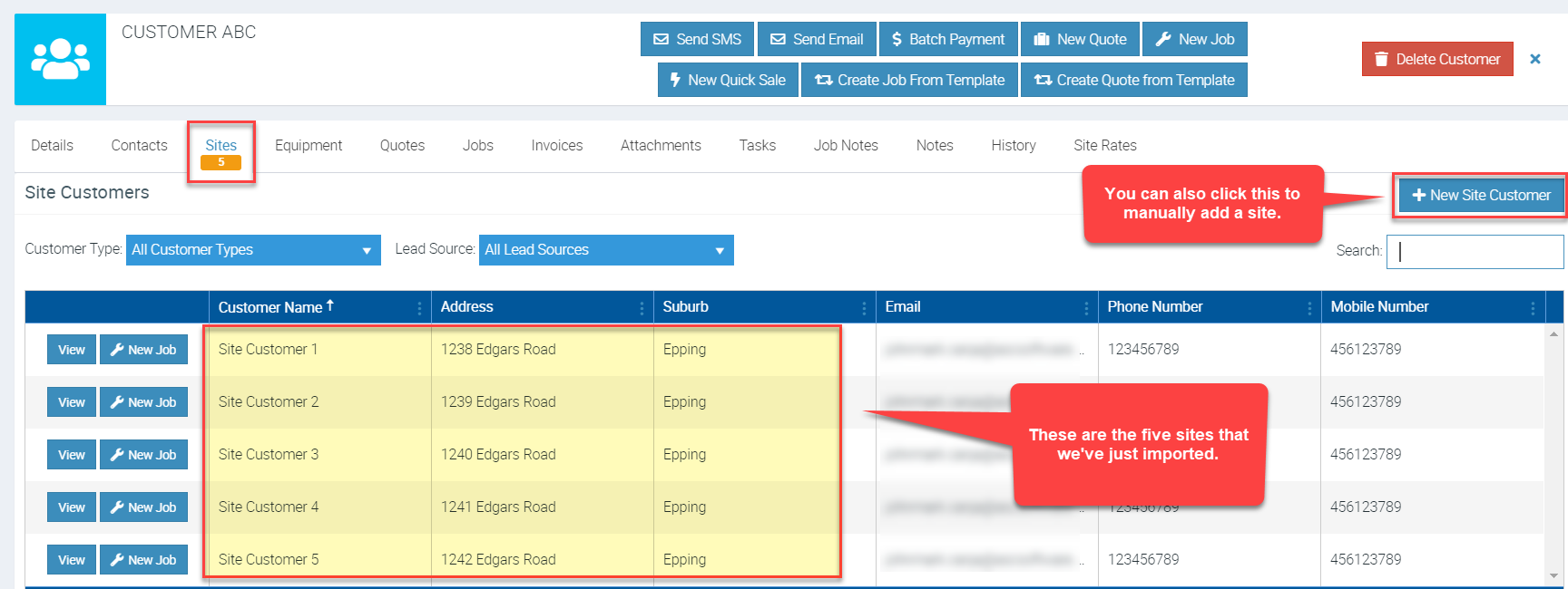 In this example, Customer ABC has now five sites added as we've imported earlier.