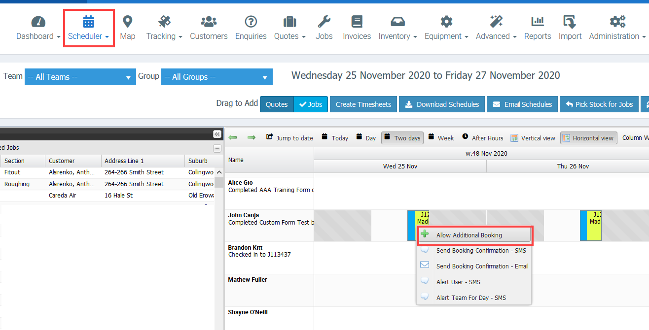 1. Go to Scheduler and right click on the job and select Allow Additional Booking.