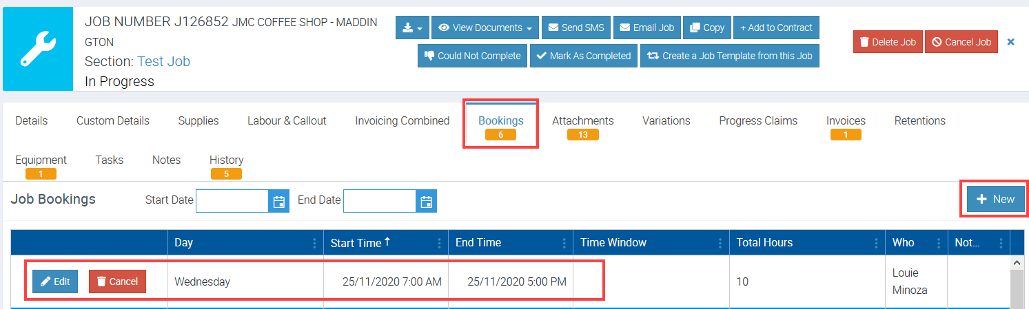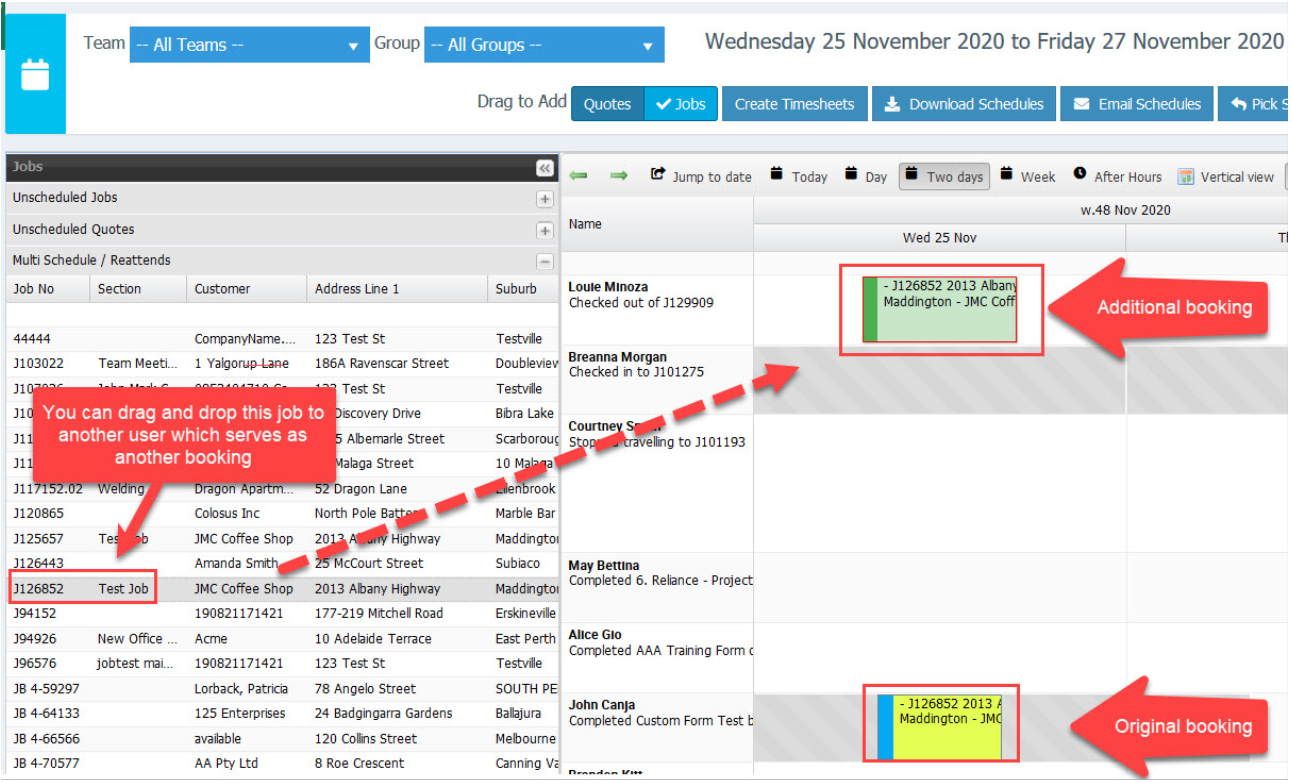 In this example, we created another booking for JobJ126852 and assigned it to another user.