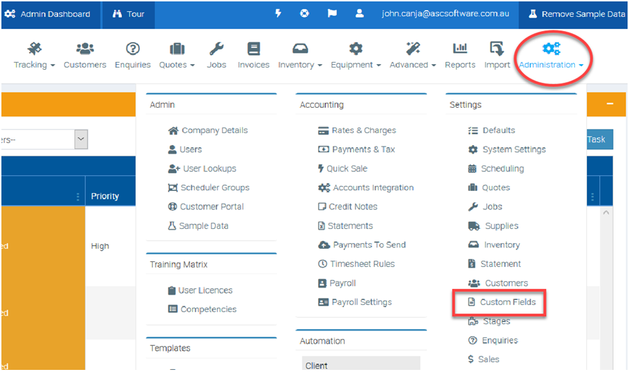 1. Log into your Ascora Web Portal and click on Administration and then select Custom Fields.