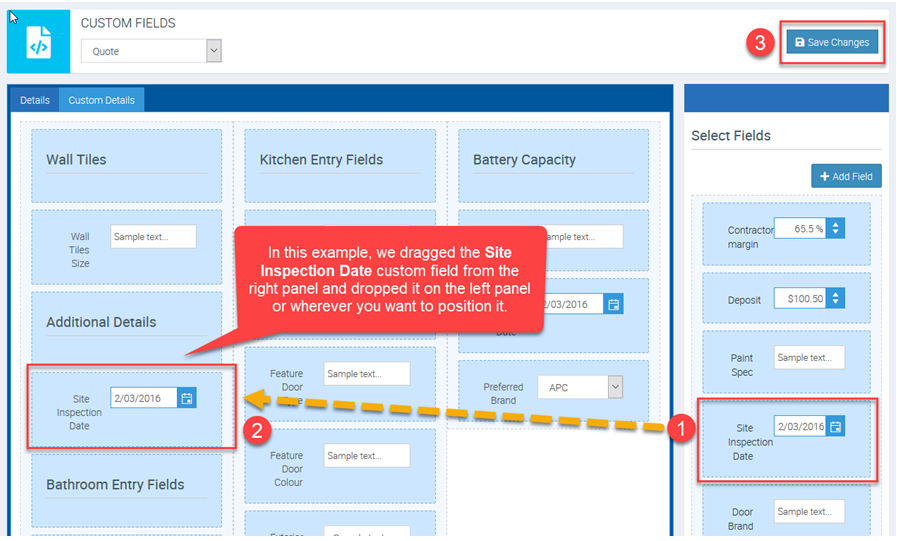 1. Your added Custom Field will now appear at the bottom of the right panel. Just drag and drop it to the left side under Custom Details tab or wherever you like to position it and click on Save Changes.