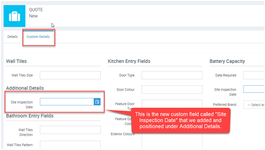 2. Click on Custom Details tab and you will see the newly added Site Inspection Date field located on the top most section the way it was positioned while making the changes earlier.