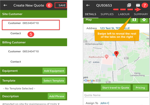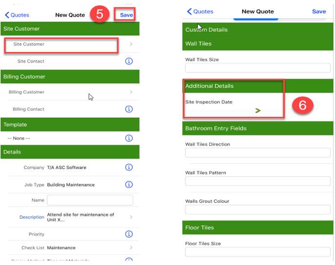 3. Tap Customer to select the Site Customer and input the necessary details then click Save.