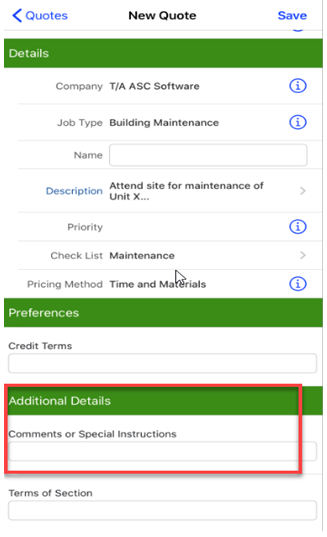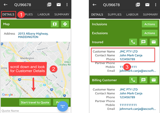 6. To proceed, tap Details from the main Quote screen then scroll down and tap Customer Name.