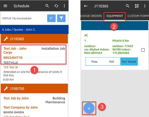 2. From your Android mobile app, select an existing job, a quote, or a customer, and scroll to the right and tap Equipment and then the + icon located at the lower left portion of the screen.