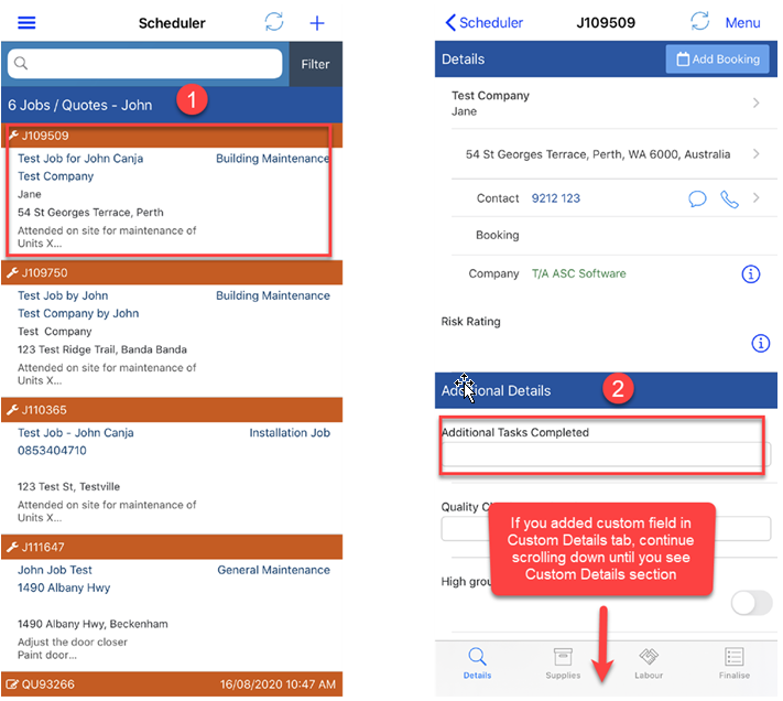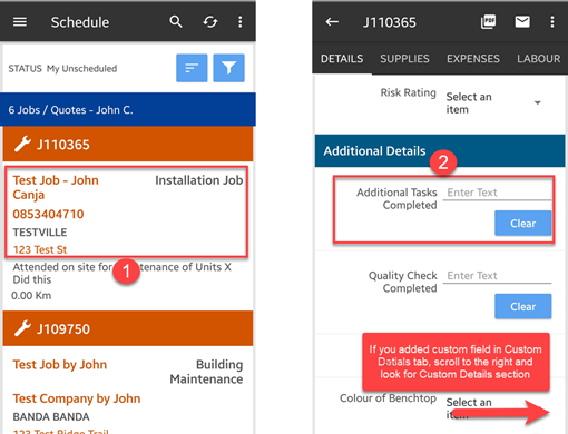 1. Tap an existing job and you should see the newly added custom field right away. In this example, we added the custom field named Additional Tasks Completed under Details tab. If you’ve added it in Custom Details tab, simply scroll down further down and you should see the Custom Details section.