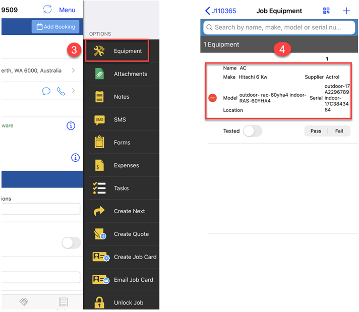 1. Repeat steps 1, 2, and 3, but choose Equipment from the dropdown menu. After saving the changes in Ascora web, you should be able to see the same information in your iOS mobile app.