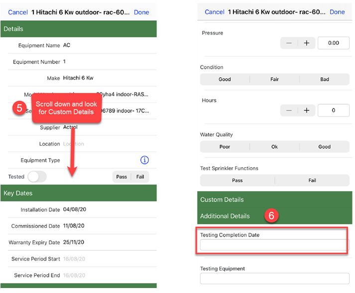 4. Scroll down and look until you see Custom Details tab. In the following example, we added the custom field named Testing Completion Date under Equipment module.