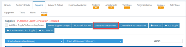 2. Supplies that have been added to the Job will display in the Supplies List. Create a Purchase Order for these Supplies by clicking the Create Purchase Orders button.