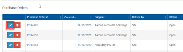 To view a Purchase Order’s details, or to edit the Purchase Order, click the Pencil icon located next to the Purchase Order Number.