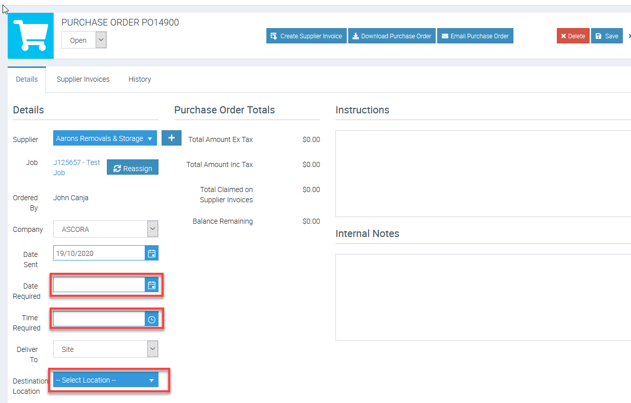 Once you have added Supplies to a Job, you can generate a Purchase Order for those Supplies directly from the Job Details.