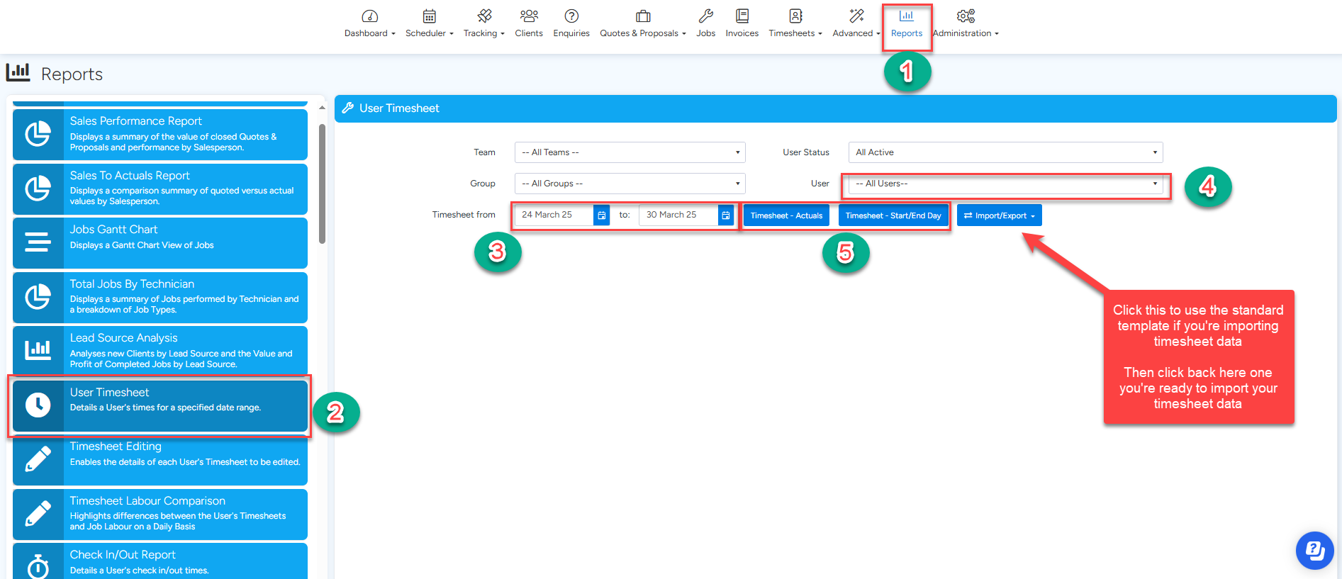 1. Go to Reports and select User Timesheet, enter the date range, select a user or all users, and click Retrieve Timesheet.